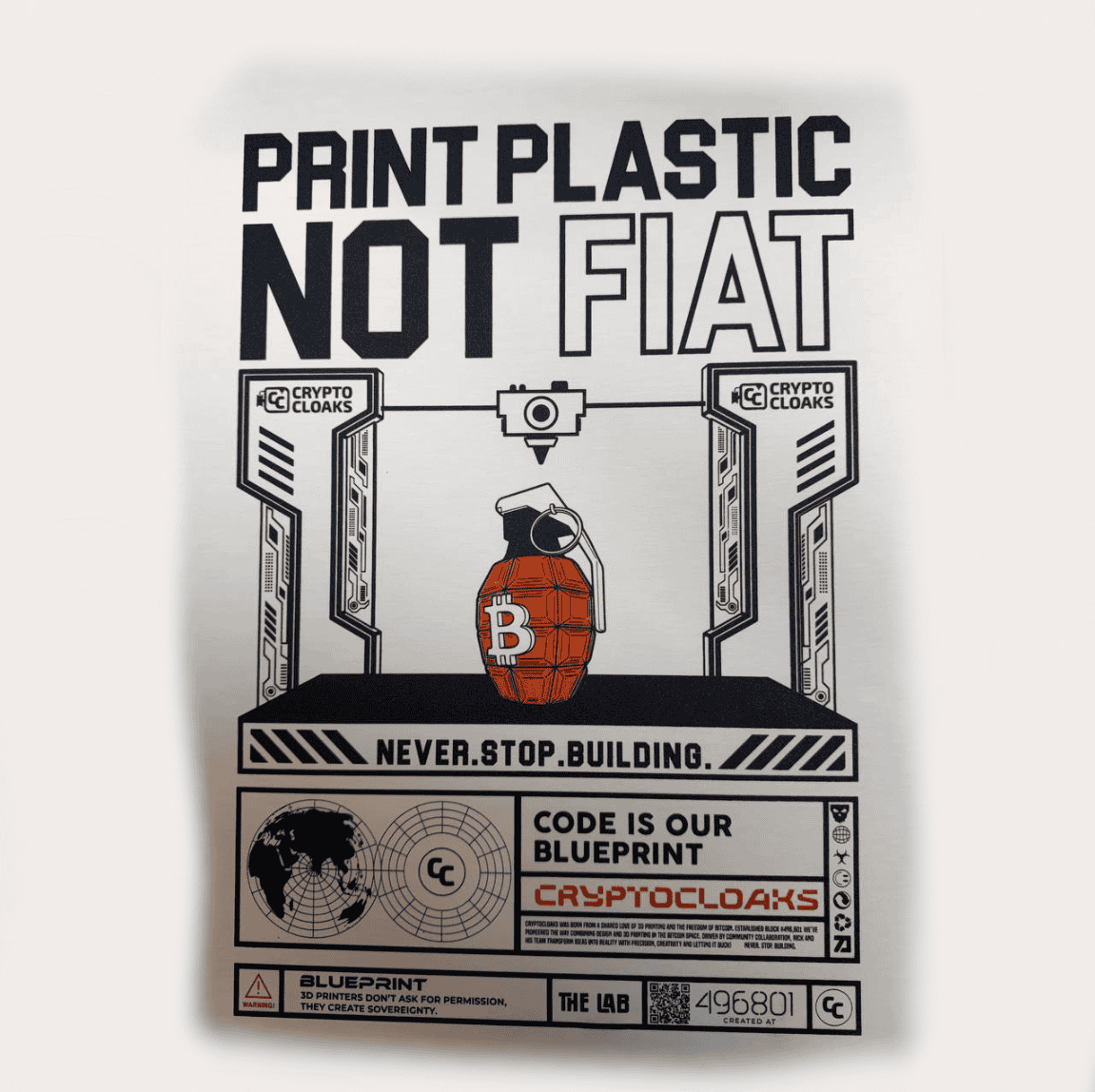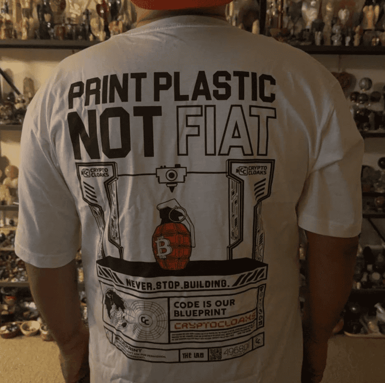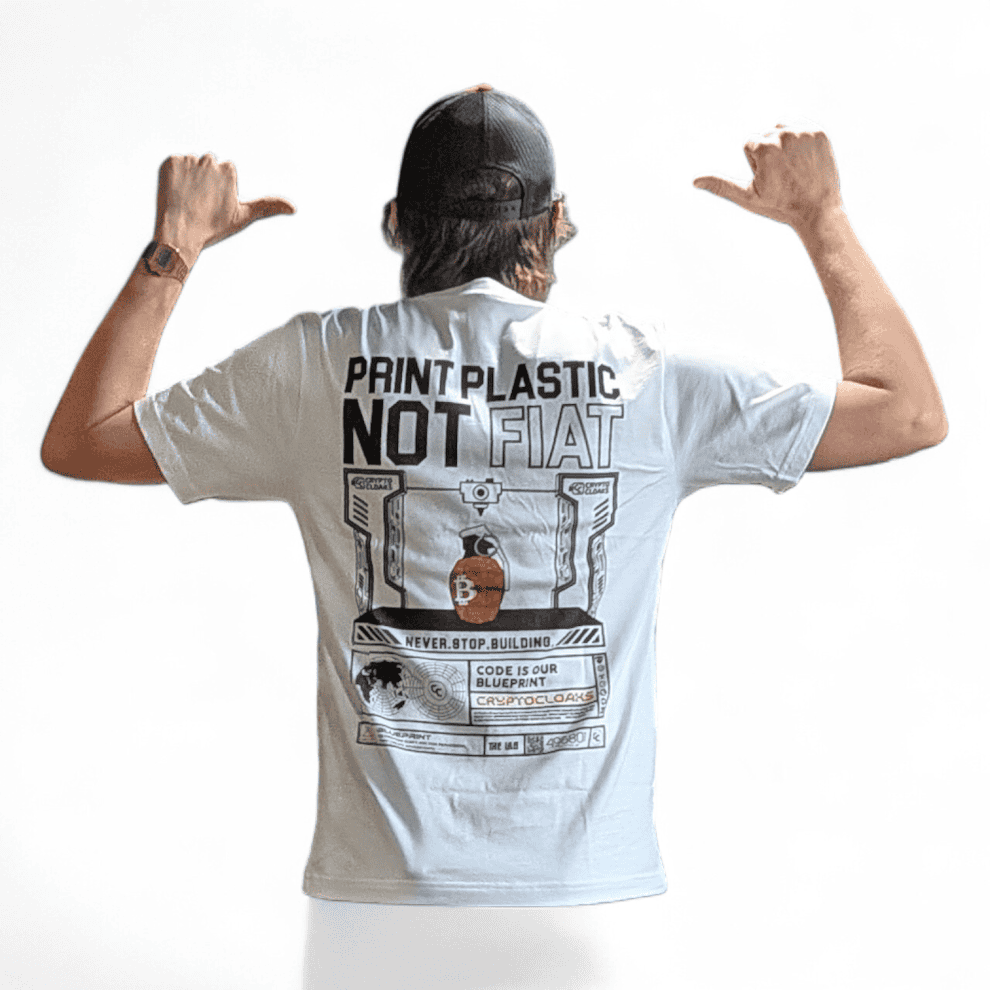 Why print money when you can print useful things? The “Print Plastic Not Fiat” T-Shirt is for the builders, the makers, and the Bitcoiners who know real value comes from creating—not inflating.