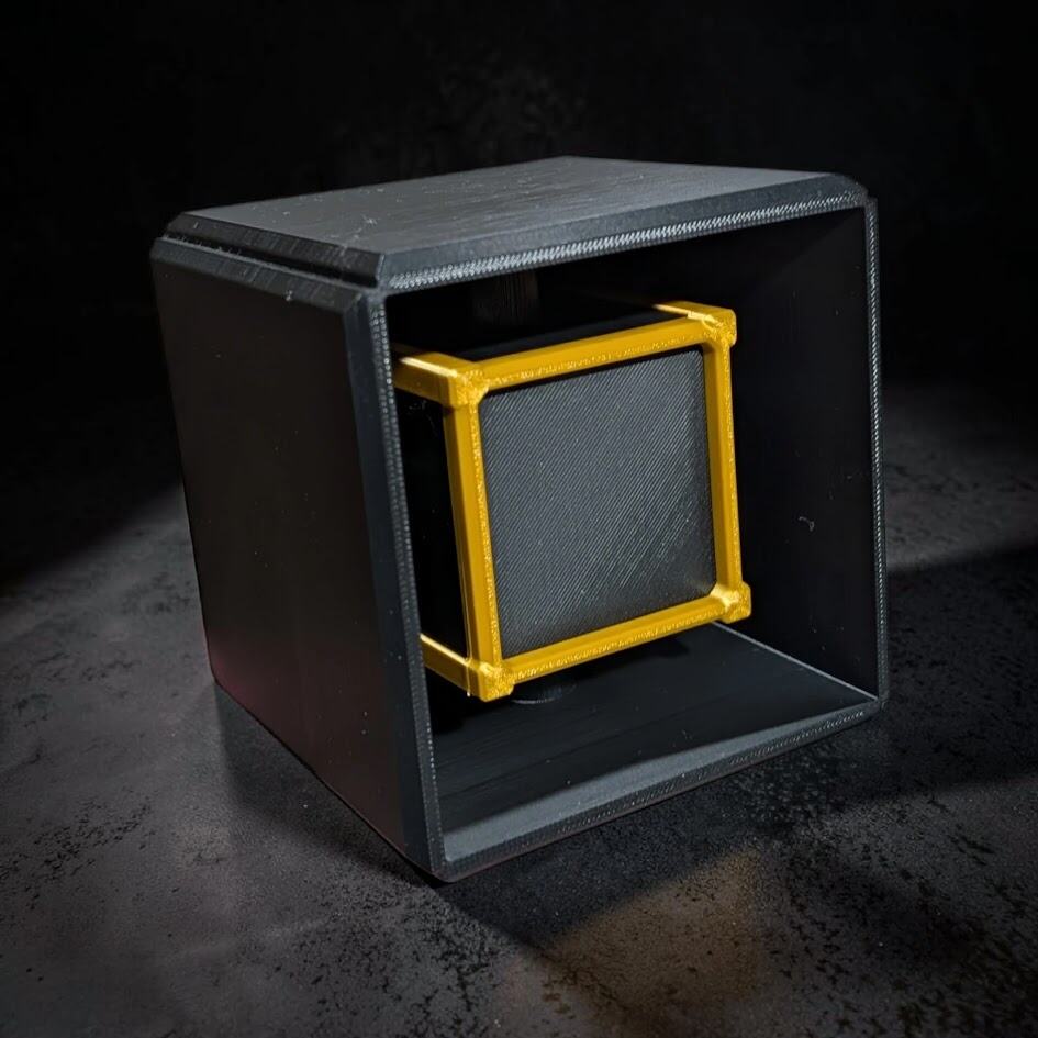 - Matte black 3D printed outer cube — laser engraved geometric pattern exterior